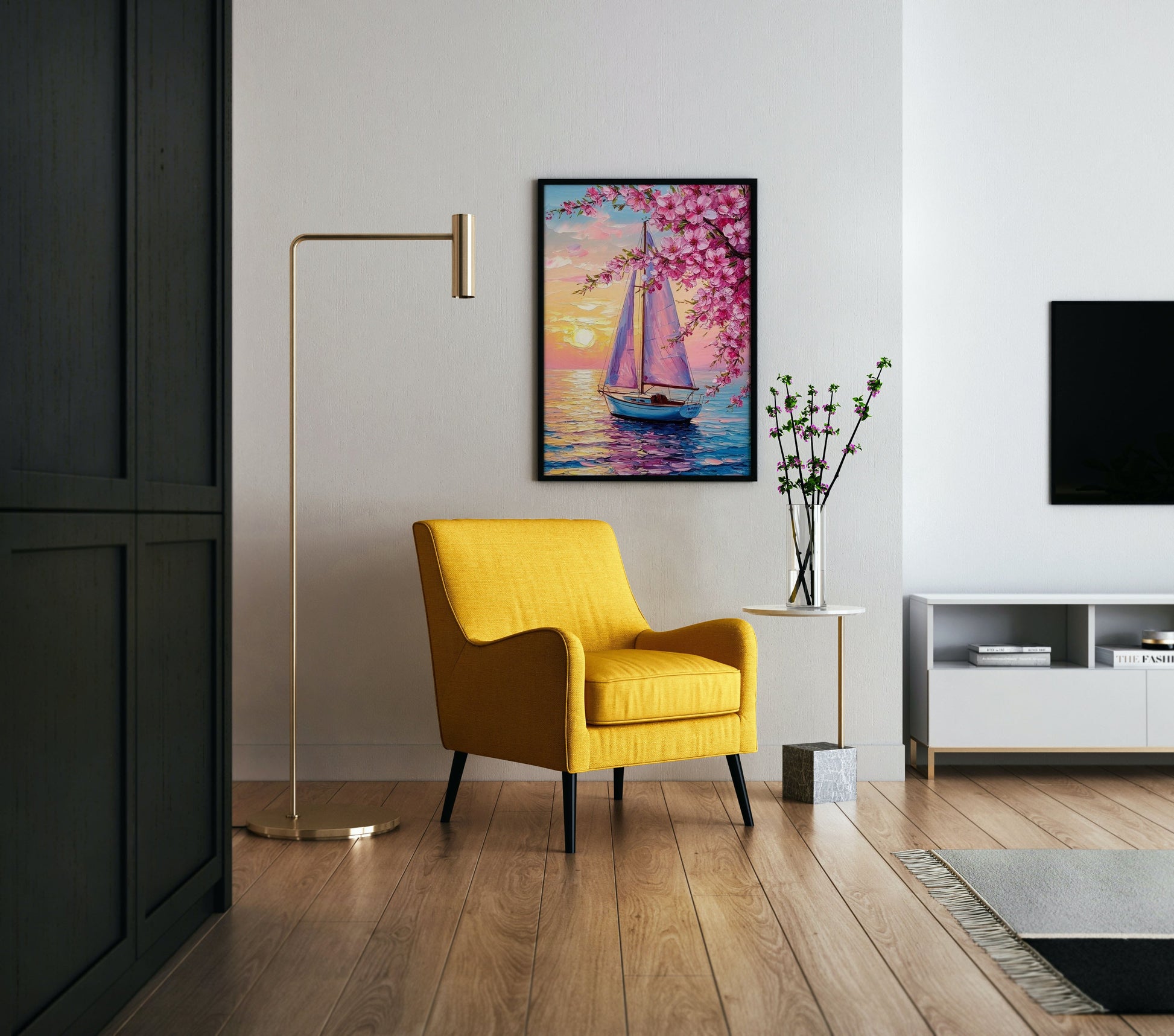 Set sail into a dreamy sunset framed by delicate cherry blossoms with this playful poster wall art. Perfect for brightening any space, it brings a splash of whimsy and calm, capturing the joy of a peaceful sail beneath blossoming skies. Add a touch of adventure and charm to your walls!