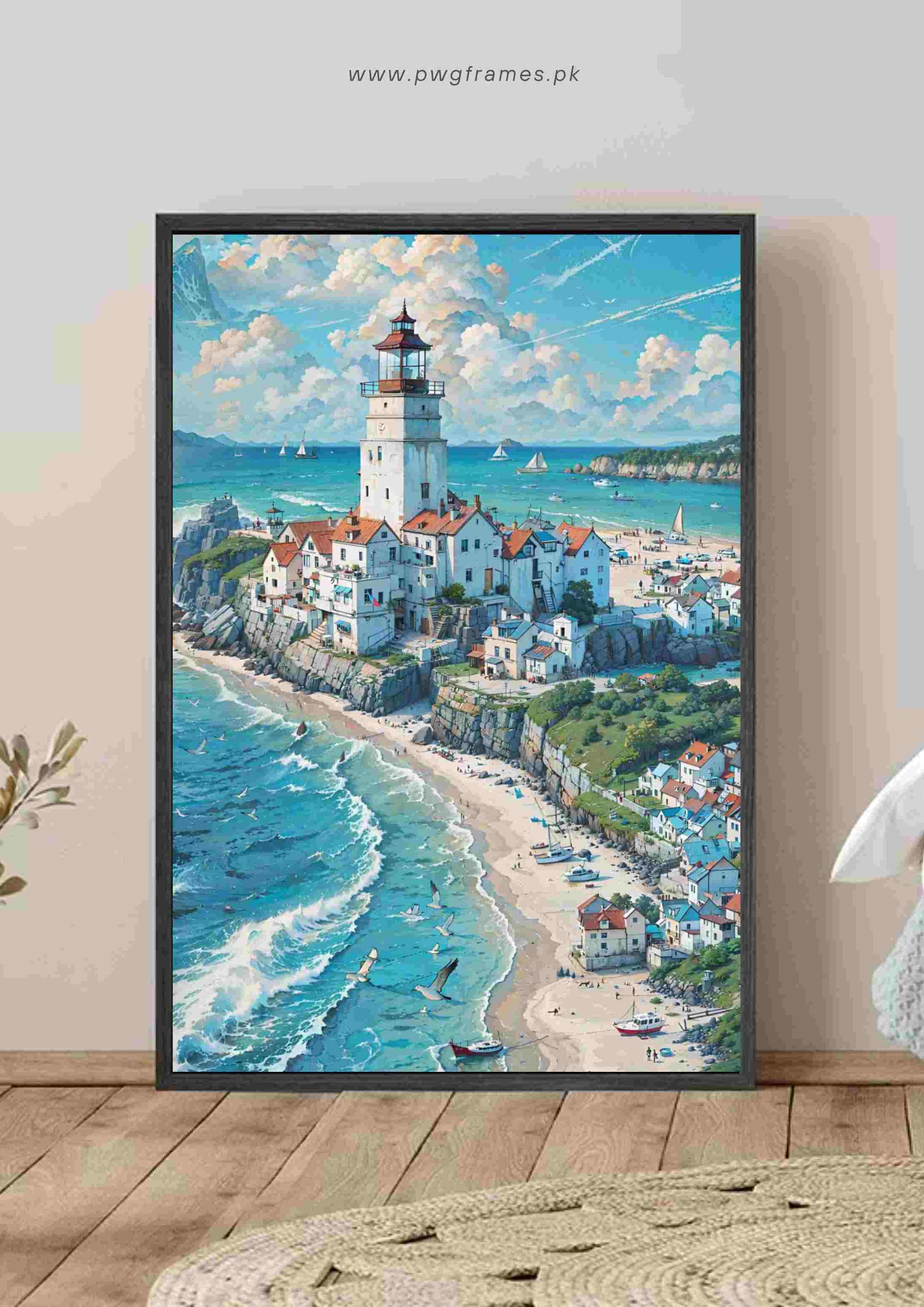 Light up your walls with the Coastal Village Lighthouse Poster! This playful artwork captures the charm of a seaside lighthouse guiding the way, perfect for adding a breezy, cheerful vibe to any room. Let your space shine with coastal adventure and whimsy.