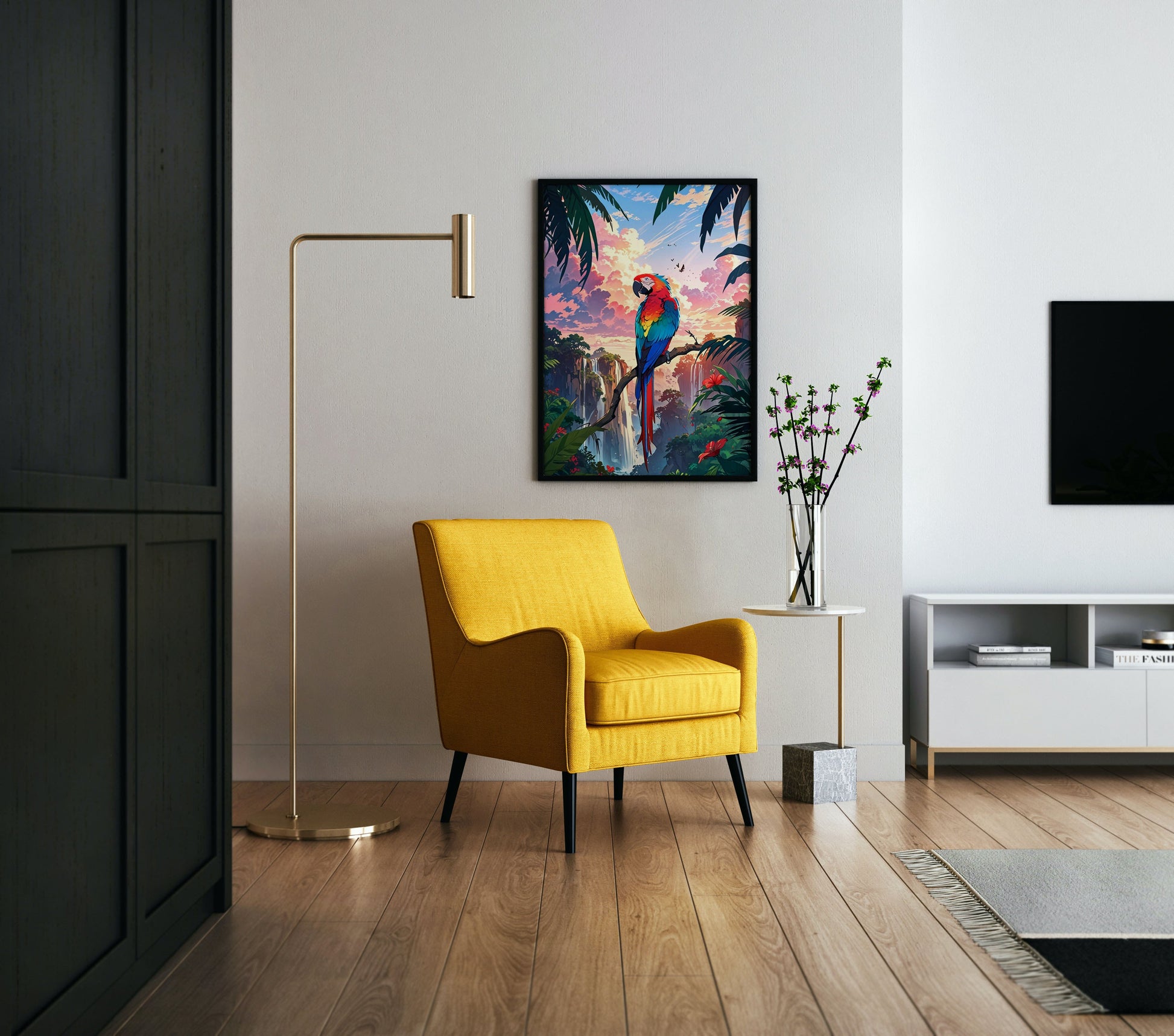 Brighten up your space with this Colorful Macaw Sunset Poster Wall Art! Featuring vibrant macaw hues against a glowing sunset backdrop, it brings a splash of tropical fun and warmth to any room. Perfect for adding a joyful and lively touch to your walls, this poster invites you to relax and daydream under a radiant sky filled with colorful feathers and sunset magic.